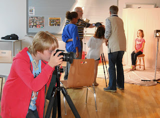 Nachdem eine Reihe von Fotos im Kasten war, wurden die Aufgaben gewechselt. Das jeweils fotografierte Kind bekam den Kamera-Chip ausgehändigt, von dem an der Bearbeitungstation sofort die Fotos heruntergeladen, gesichtet und für die weitere Bearbeitung ausgesucht wurden. Neben den Kameras an den Stationen stand auch zwei Reportagekameras zur Verfügung, mit denen die Kinder den Ablauf des Geschehens und das Drumherum dokumentieren konnten. Wir standen als Helfer bereit, um bei der Bedienung der Kamera, der optimalen Einstellung, der Beleuchtung und dem Motivaufbau zu assistieren. Dies erfolgte jedoch behutsam mehr aus dem Hintergrund, um den Kindern möglichst viel Raum für eigene Kreativität und Ideen zu lassen.